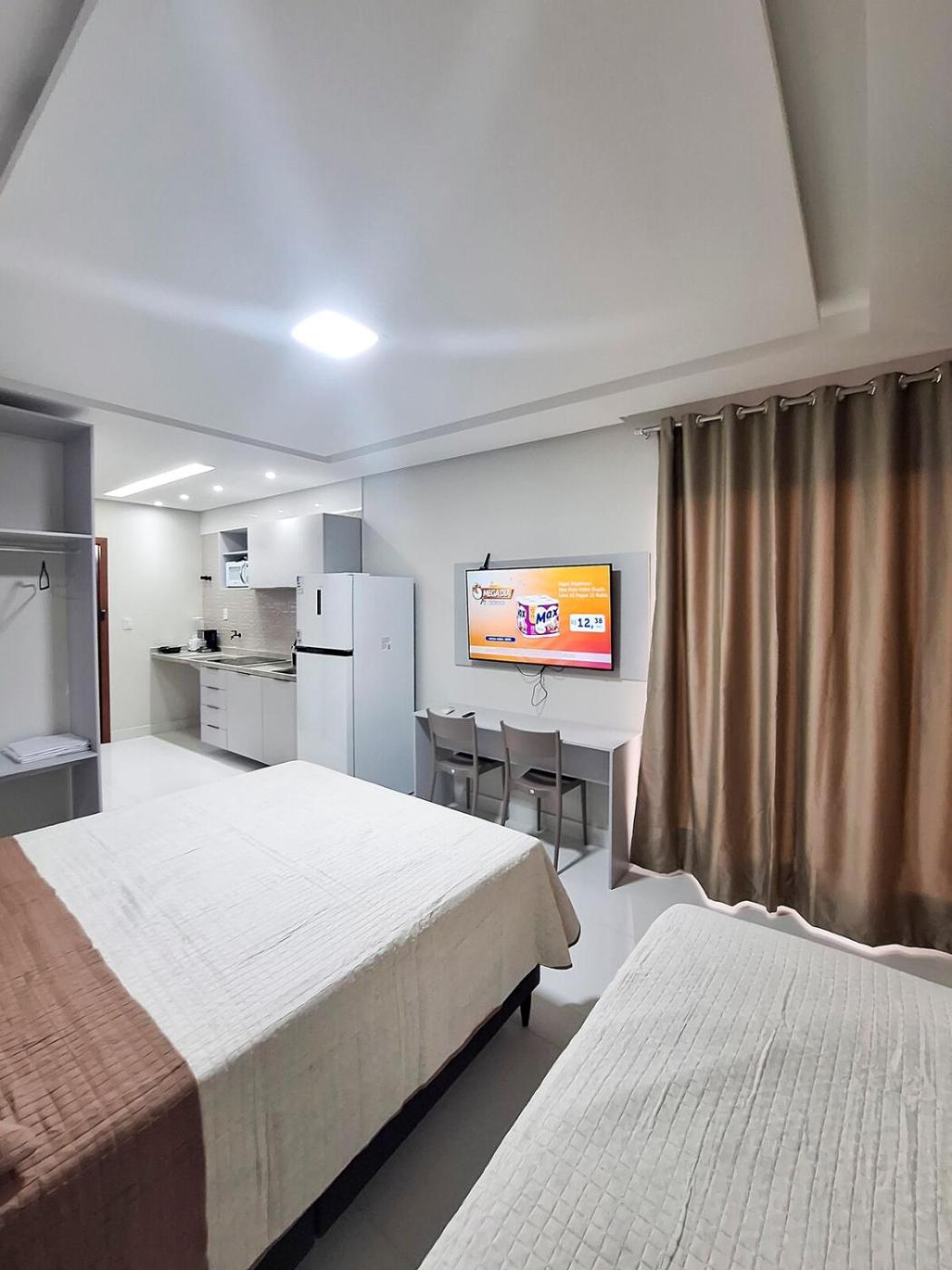 Estúdio. The studio features air conditioning, a tea and coffee maker, as well as a private bathroom boasting a shower. The fully equipped kitchen has a stovetop, a refrigerator, kitchenware and a microwave. This studio offers a flat-screen TV. The unit has 2 beds.