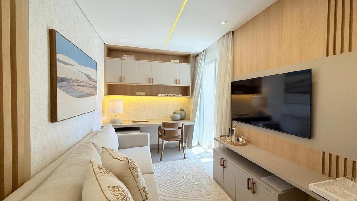 Este apartamento com ar condicionado apresenta 1 quarto, uma televisão e uma cozinha com frigorífico e forno.