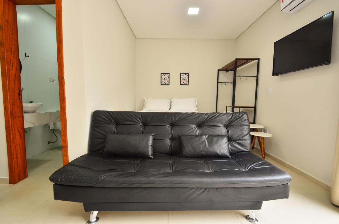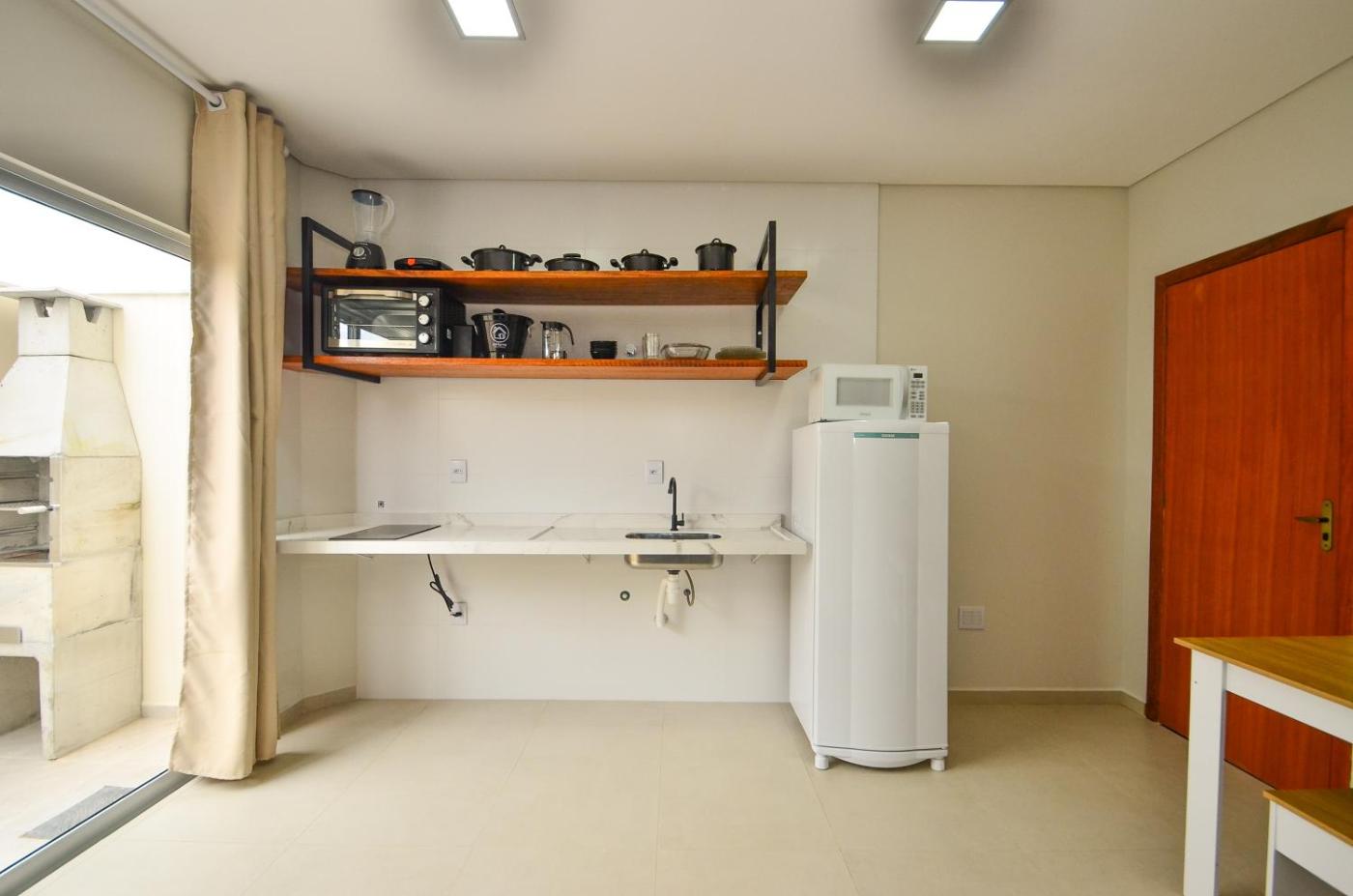 Estúdio. The apartment provides air conditioning and a tea and coffee maker, as well as a private bathroom featuring a hairdryer. Guests will find a stovetop, a refrigerator, an oven and a microwave in the kitchen. The apartment also offers a barbecue. This apartment features a TV. The unit offers 2 beds.