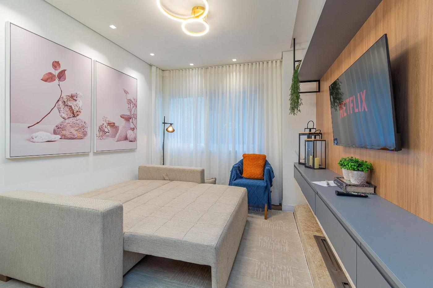 Este apartamento tem 1 quarto, cozinha com um frigorÃfico e um forno, uma televisão, uma área de estar e 2 casas de banho dispondo de chuveiro. Toalhas e roupa de cama são providenciadas neste apartamento.