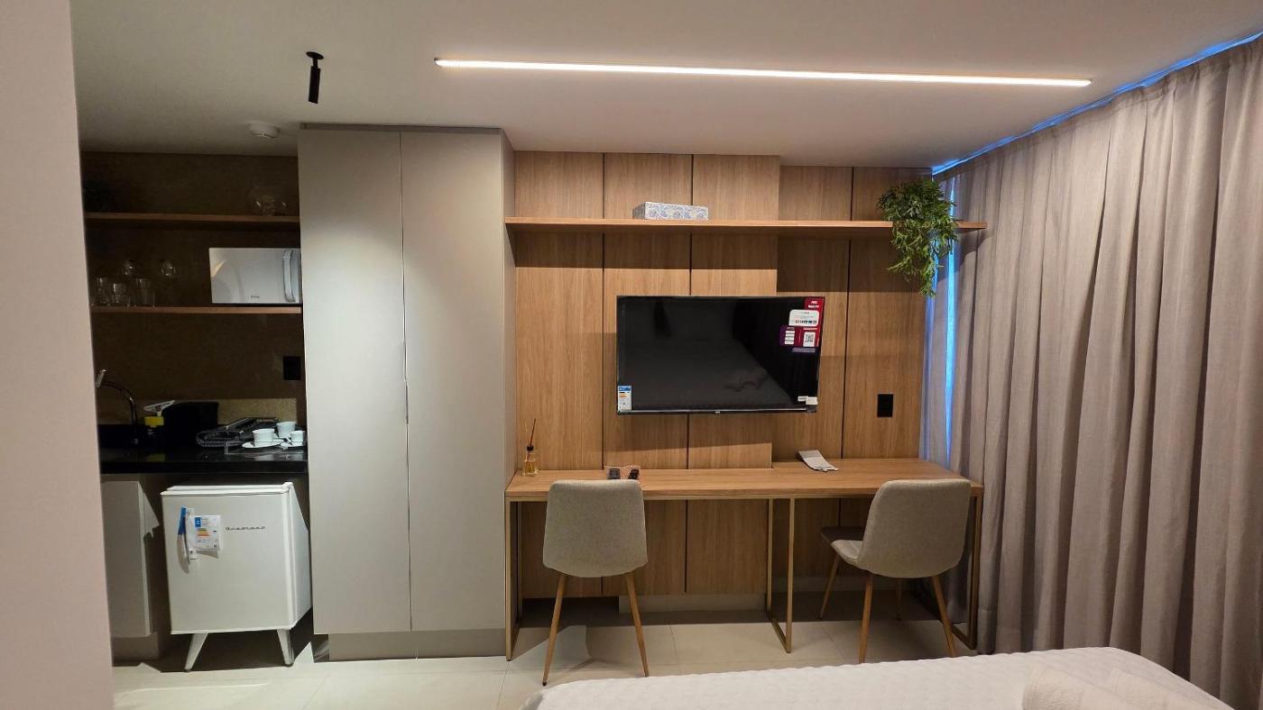 Estúdio Standard. The studios kitchen, which has kitchenware and a microwave, is available for cooking and storing food. A seating area with a TV, a desk and a private bathroom are offered in this studio. The unit has 1 bed and 1 futon. ;
