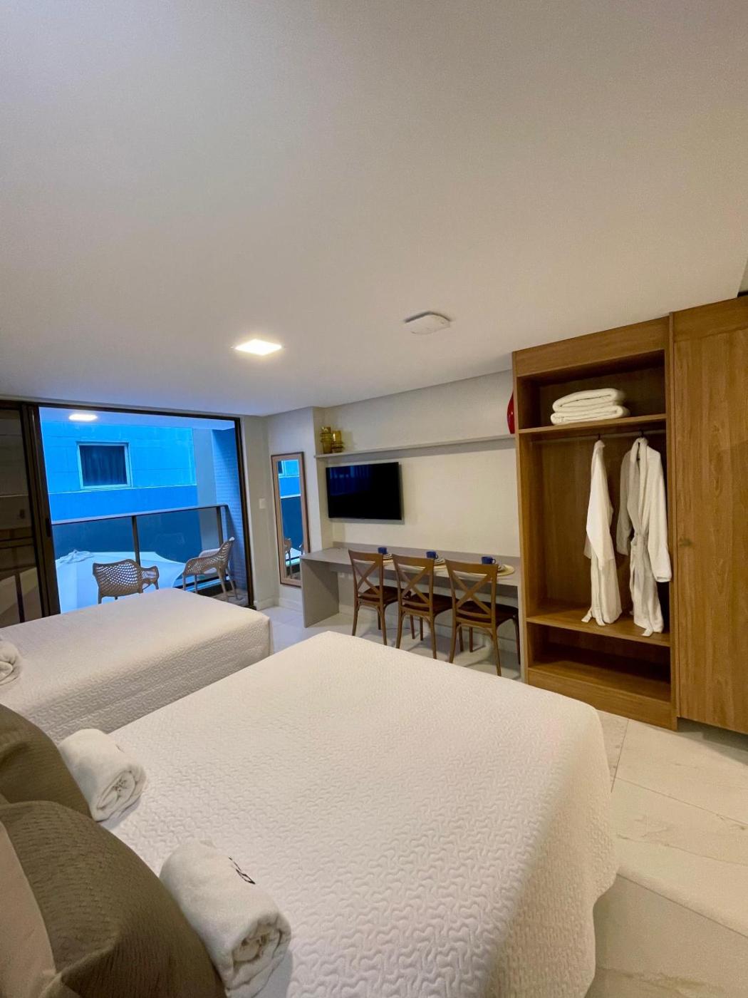 Estúdio Duplo Deluxe. This studios special feature is the pool with a view. The studio provides air conditioning, a coffee machine, as well as a private bathroom featuring a shower and a hairdryer. In the fully equipped kitchen, guests will find a stovetop, a refrigerator, kitchenware and a microwave. This studio features a seating area, a dining area, a TV and a balcony. The unit offers 2 beds. ;
