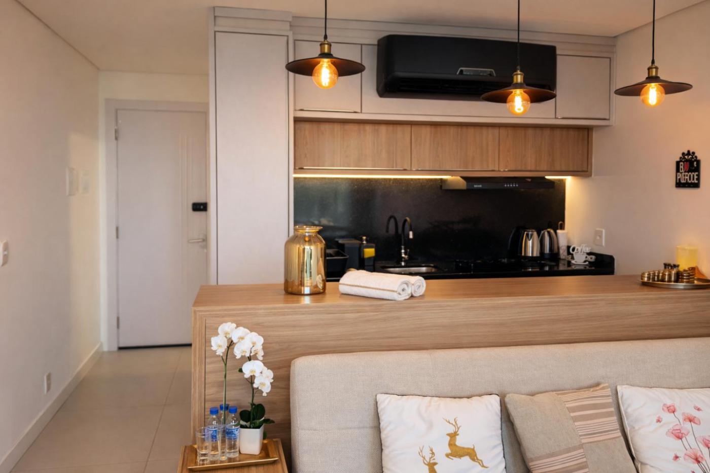 Apartamento com 1 Quarto. Guests can make meals in the kitchen that has a stovetop, kitchenware, a microwave and a tea and coffee maker. The air-conditioned apartment features a flat-screen TV with streaming services, a washing machine, a private entrance, soundproof walls as well as mountain views. The unit has 2 beds.