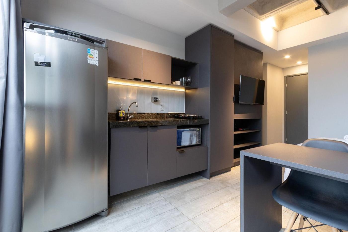 Apartamento com Vista Jardim. The air-conditioned apartment has 1 bedroom, 1 bathroom and a kitchen. Guests can make meals in the kitchen that features a stovetop, a refrigerator, kitchenware and a microwave. This apartment features a wardrobe and a TV. The unit has 1 bed.