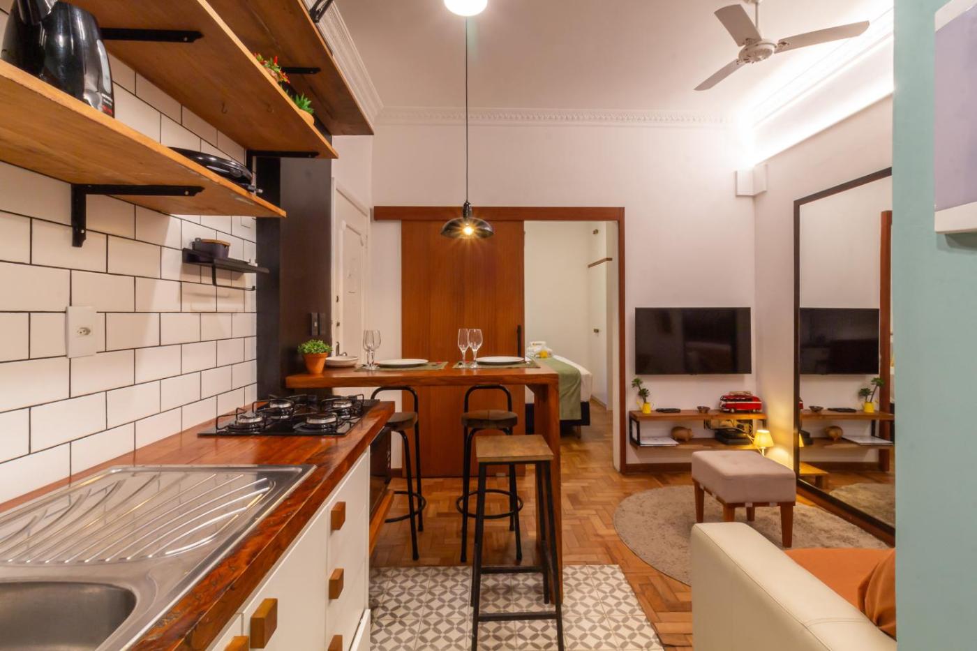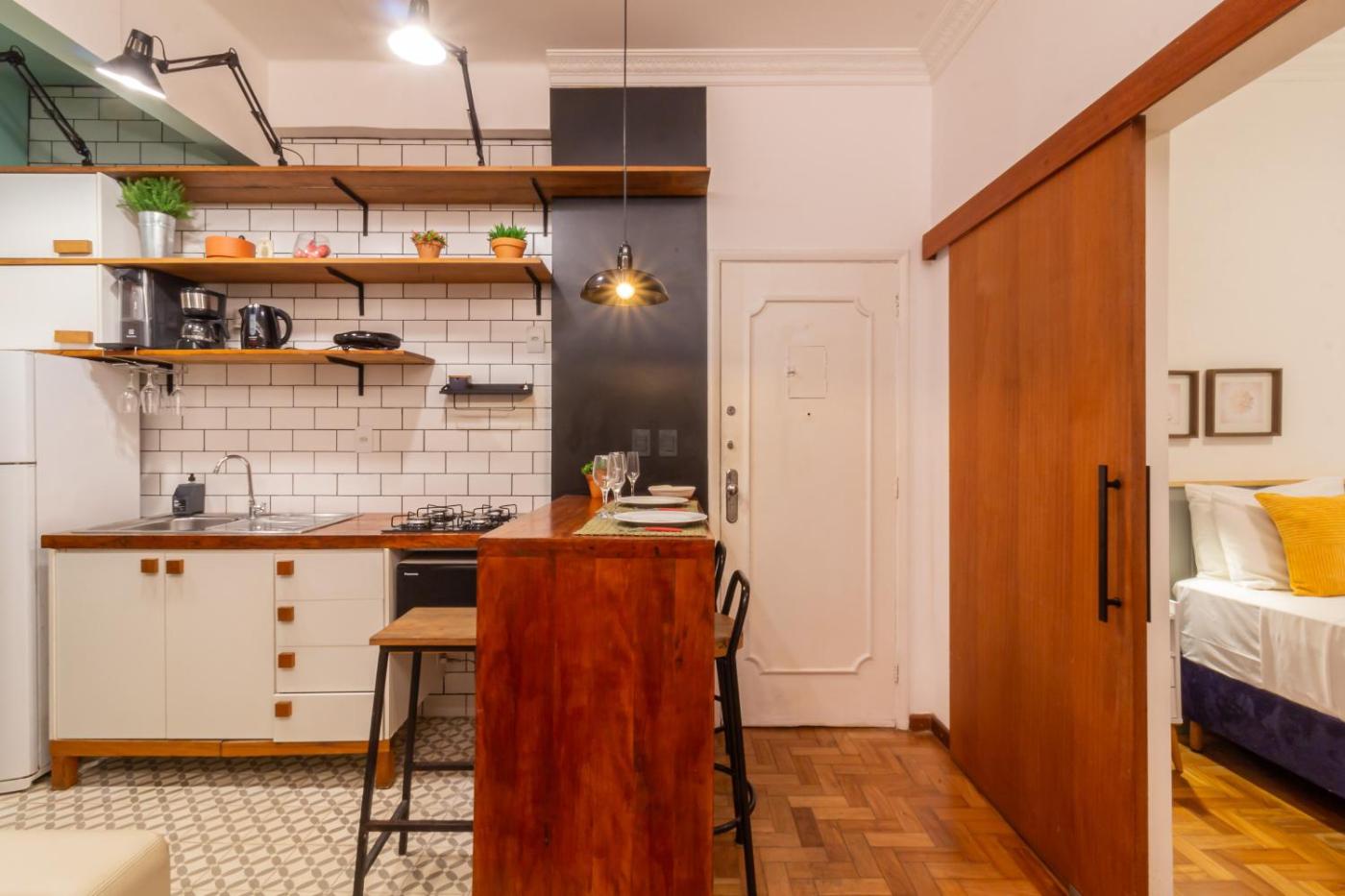 Estúdio Duplo Deluxe. In the kitchen, guests will find a stovetop, a refrigerator, kitchenware and a microwave. This air-conditioned studio features a private bathroom, a private entrance, a tea and coffee maker as well as a terrace.