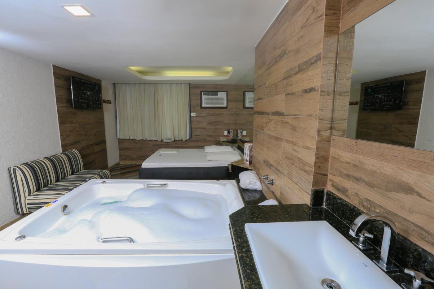 Quarto Duplo com Banheira de Hidromassagem. The spa bath is a top feature of this double room. Featuring free toiletries and bathrobes, this double room includes a private bathroom with a shower and a hairdryer. This double room is air-conditioned and has a flat-screen TV with cable channels, a minibar, a sofa and a tiled floor. The unit has 1 bed. ;