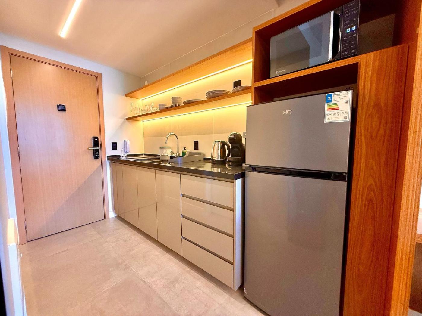 Estúdio. In the kitchen, guests will find a stovetop, a refrigerator, kitchenware and a microwave. This wheelchair accessible studio features air conditioning, a seating area with a flat-screen TV and a roll-in shower. The unit offers 1 bed.