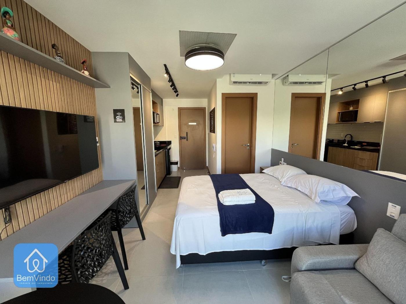 Apartamento com 1 Quarto. The well-fitted kitchen has a stovetop, a refrigerator, kitchenware and a microwave. This apartment is air-conditioned and features a private bathroom, a seating area and a quiet street view. The unit has 2 beds.