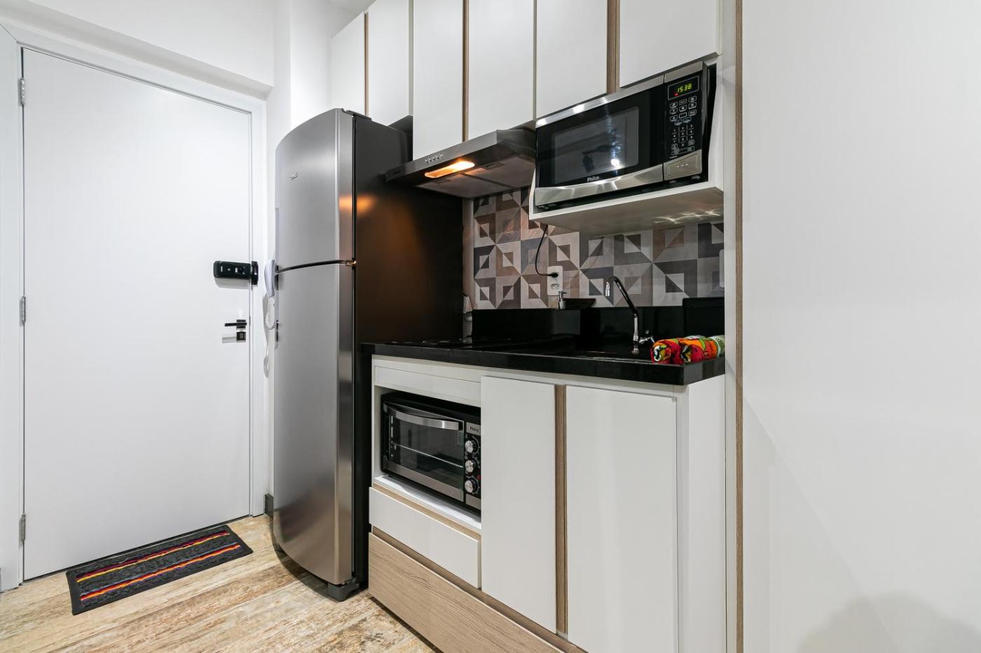 Estúdio com Varanda. Meals can be prepared in the well-fitted kitchen, which features a stovetop, a refrigerator, kitchenware and an oven. This air-conditioned studio has a desk, a balcony, city views and a private bathroom. The unit has 1 bed.