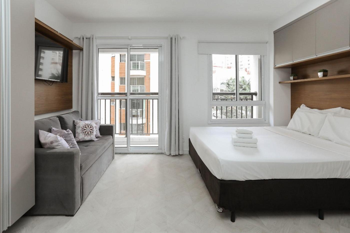 Estúdio Standard. The studio has a private bathroom, air conditioning, a washing machine, as well as a seating area with a TV. The studios kitchen is available for cooking and storing food. The studio features a coffee machine, a wardrobe, tumble dryer along with a balcony. The unit has 1 bed.
